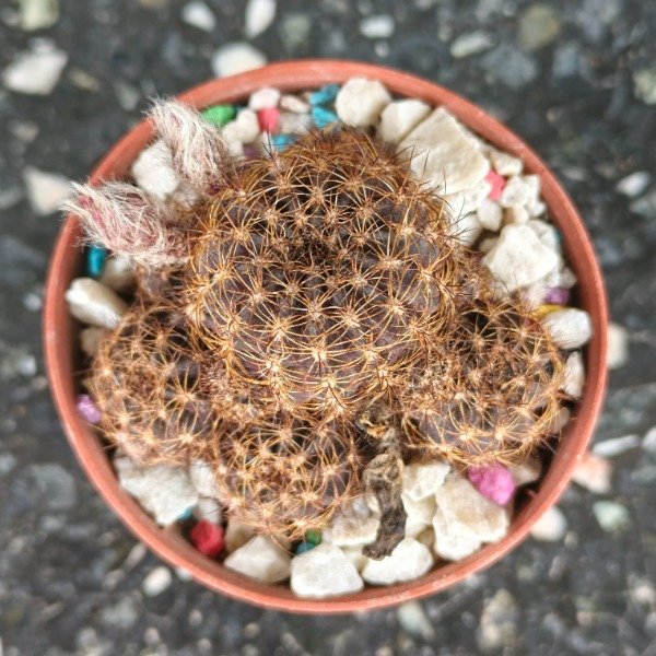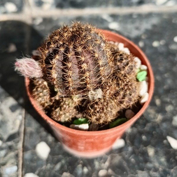 Hermoso cactus híbrido de color marrón oscuro con flores rojas. Maceta Nº6