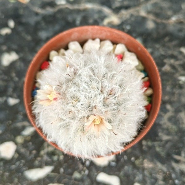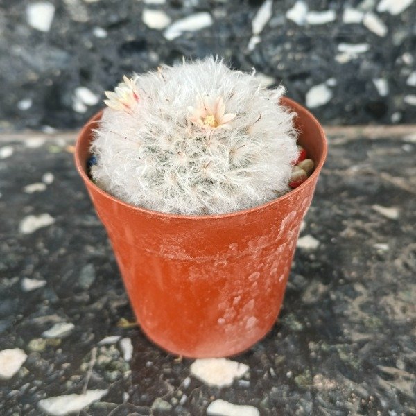 Cactus en maceta Nº6, con pelos que parecen plumas. Es de facil cuidado y requiere poca agua y sol directo. Sus flores son blanas con lineas rosadas.