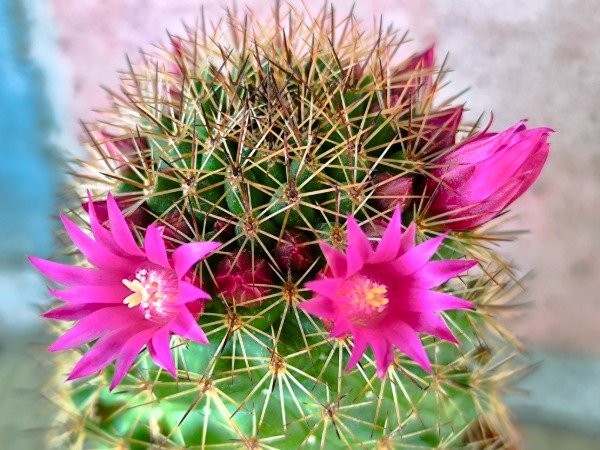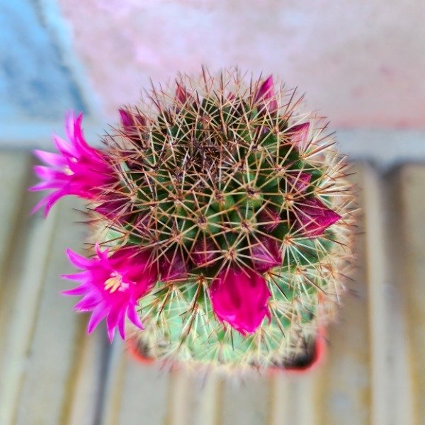 Mamillaria en maceta Nº6, tiene flores rosa fuerte. Requiere sol directo y poco riego para crecer.